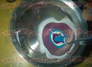 - Repeat the same procedure with other colors of your choice. Let this drop of the nail polish fall in the center of the other polish-slick. Make alternate rings of the desired colors as shown in the image below.